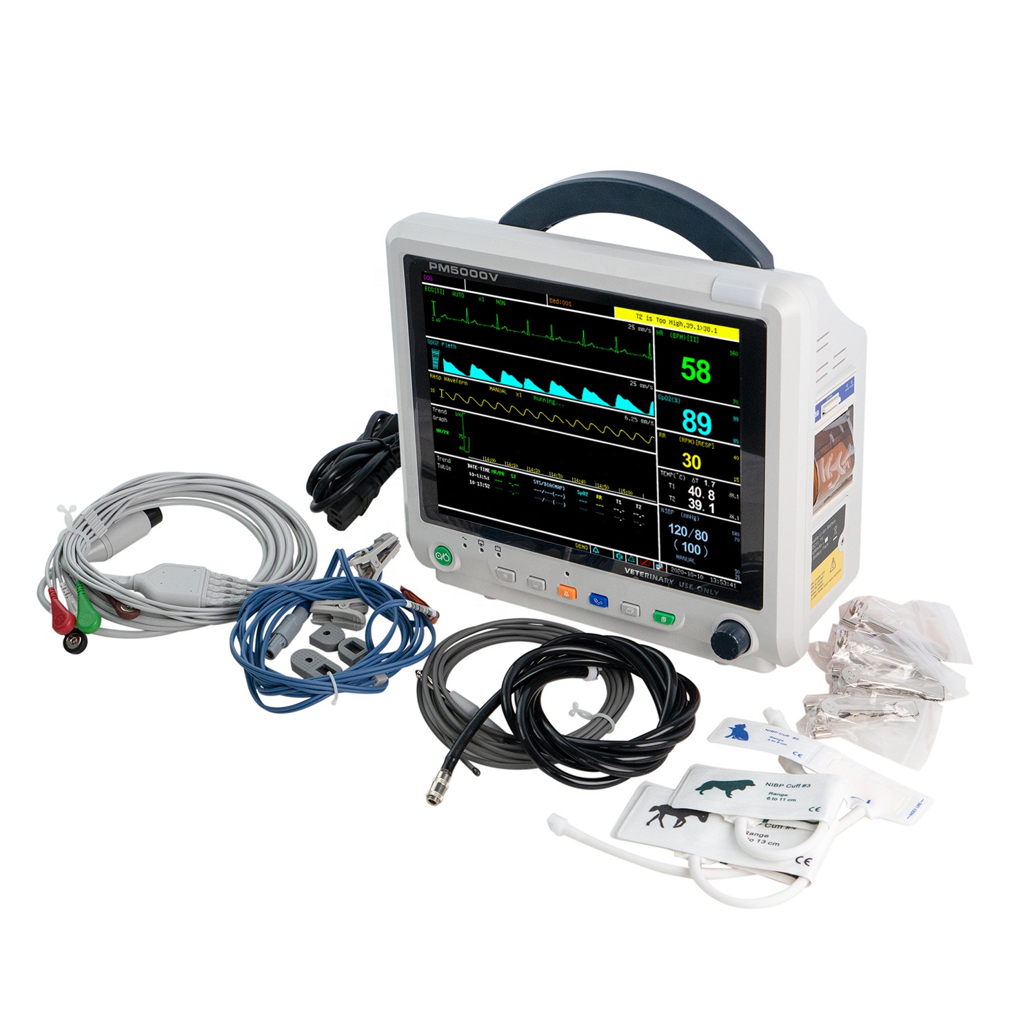 El M5000V es un monitor veterinario multiparamétrico con pantalla LCD de alta resolución de 12,1 pulgadas. Está destinado a ser utilizado en clínicas y hospitales veterinarios para medir la Saturación de Oxígeno (SpO2), la frecuencia del pulso (PR), la presión arterial no invasiva (NIBP), la temperatura (Temp), electrocardiograma (ECG) de 5/3 derivaciones y la frecuencia respiratoria de los animales (RESP).